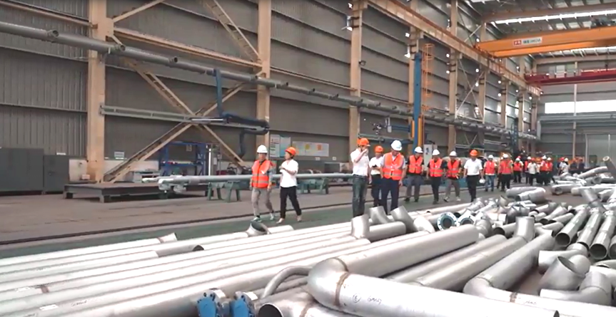 下午與會人員參觀了金童裝備公司的管道預制自動化生產(chǎn)線和二期新石化高端裝備研發(fā)和制造項目建設工地,并對中石油廣西乙烯項目在制的合金鋼預制管道進行了材料追溯審核和質(zhì)量控制的檢查和交流。